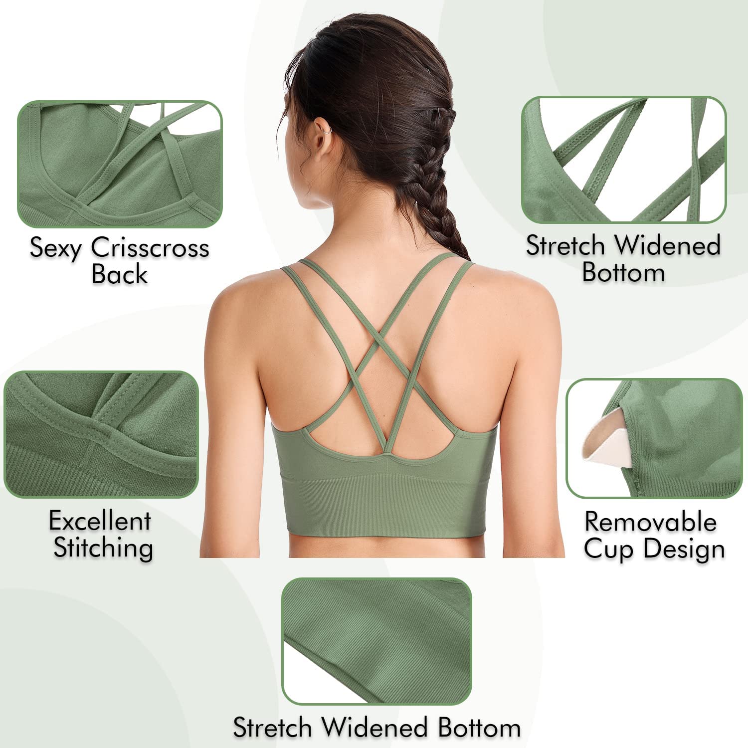 • ✔REMOVABLE SOFT PADS: Soft pads for the bralettes portion can be removed when you need wash.Crop workout bras with removable soft padding, offer you more flexibility and extra coverage support.Slightly padded on the front, which always retains its shape and prevent bra bulges, caresses your figure to adjust to your curves.And it can be easy to put in and out.