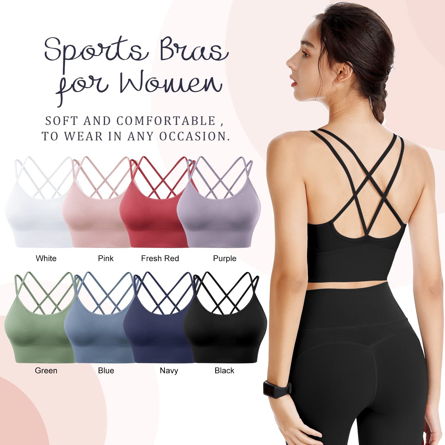 • ✔Multiple Colors Package For Choose: Our sports bras for women have lots of available cute colors and practical cost-effective color sets to meet your various need.You can select 2 pack, 3 pack,4 pack and 5 pack according to you need.Our sports bras for women will complement your workout or everyday outfit perfectly. Let you exercise always keep free, comfortable, let women love sports.