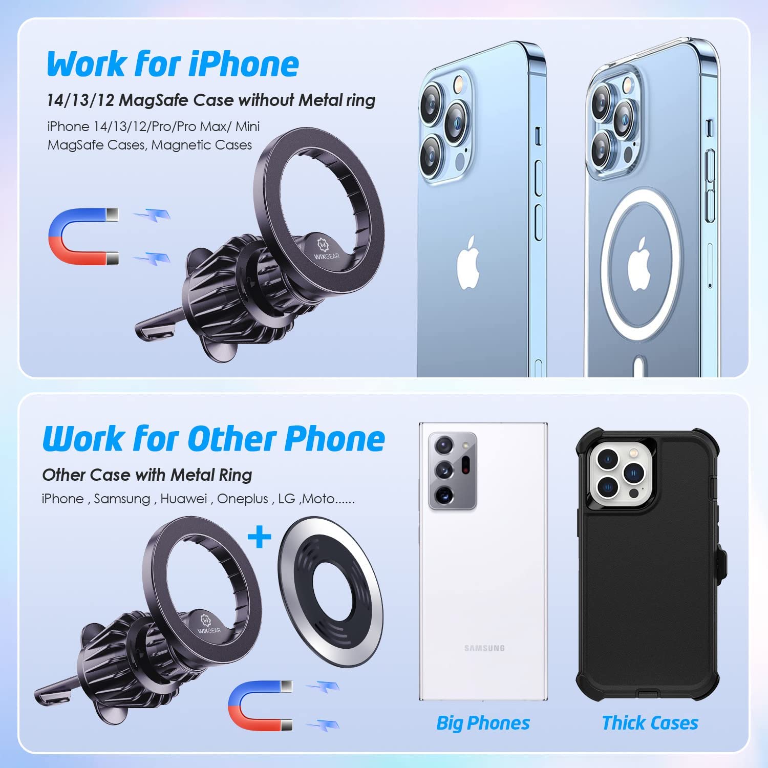 Magnetic Phone Mount Fit For MagSafe: This car mount for iPhone MagSafe is specially designed to fit MagSafe phones its magnets fit the phone's magnetic ring inside, so it doesn't affect the phone's charging capability.