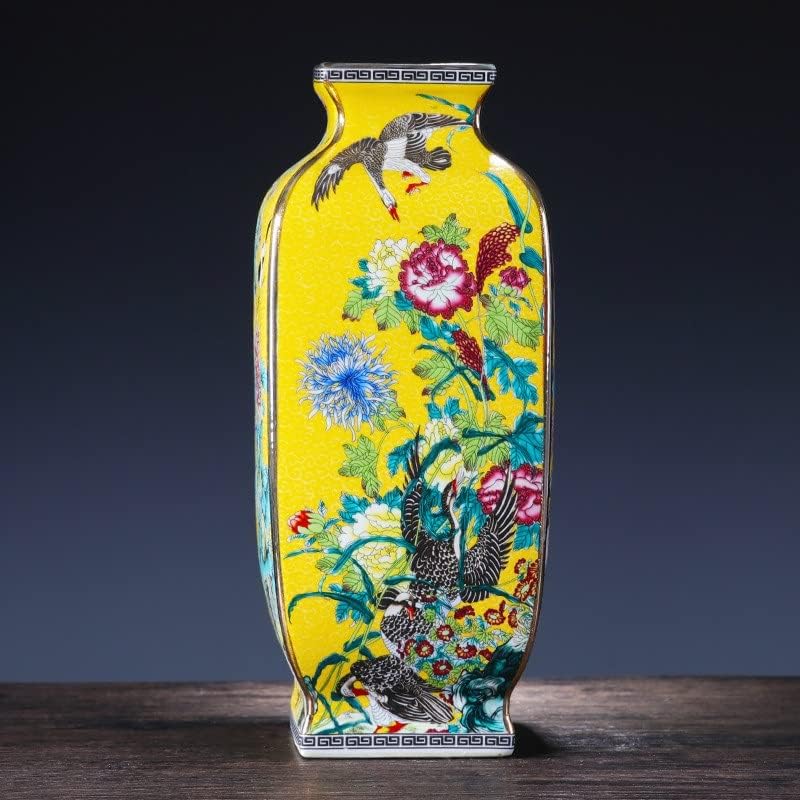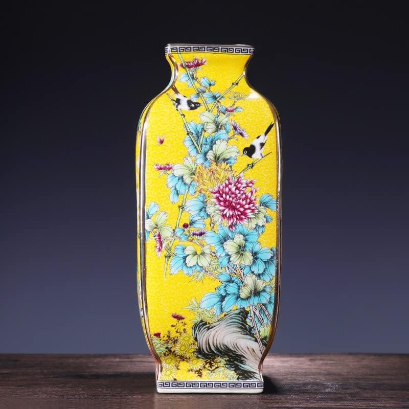HOUKAI Antique Chinese Style Large Yellow Ceramic Flower Vase Four Sides Pattern Classical Porcelain Vase