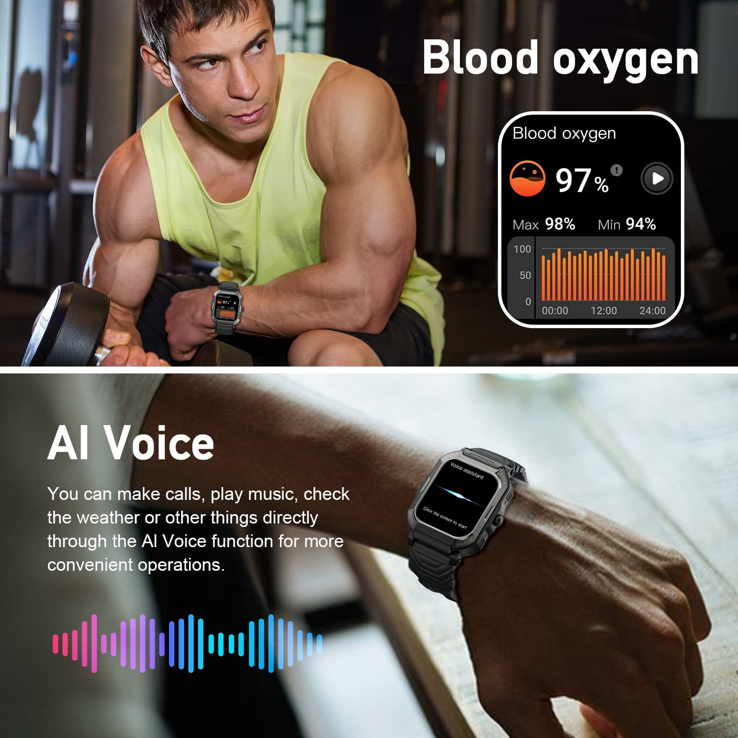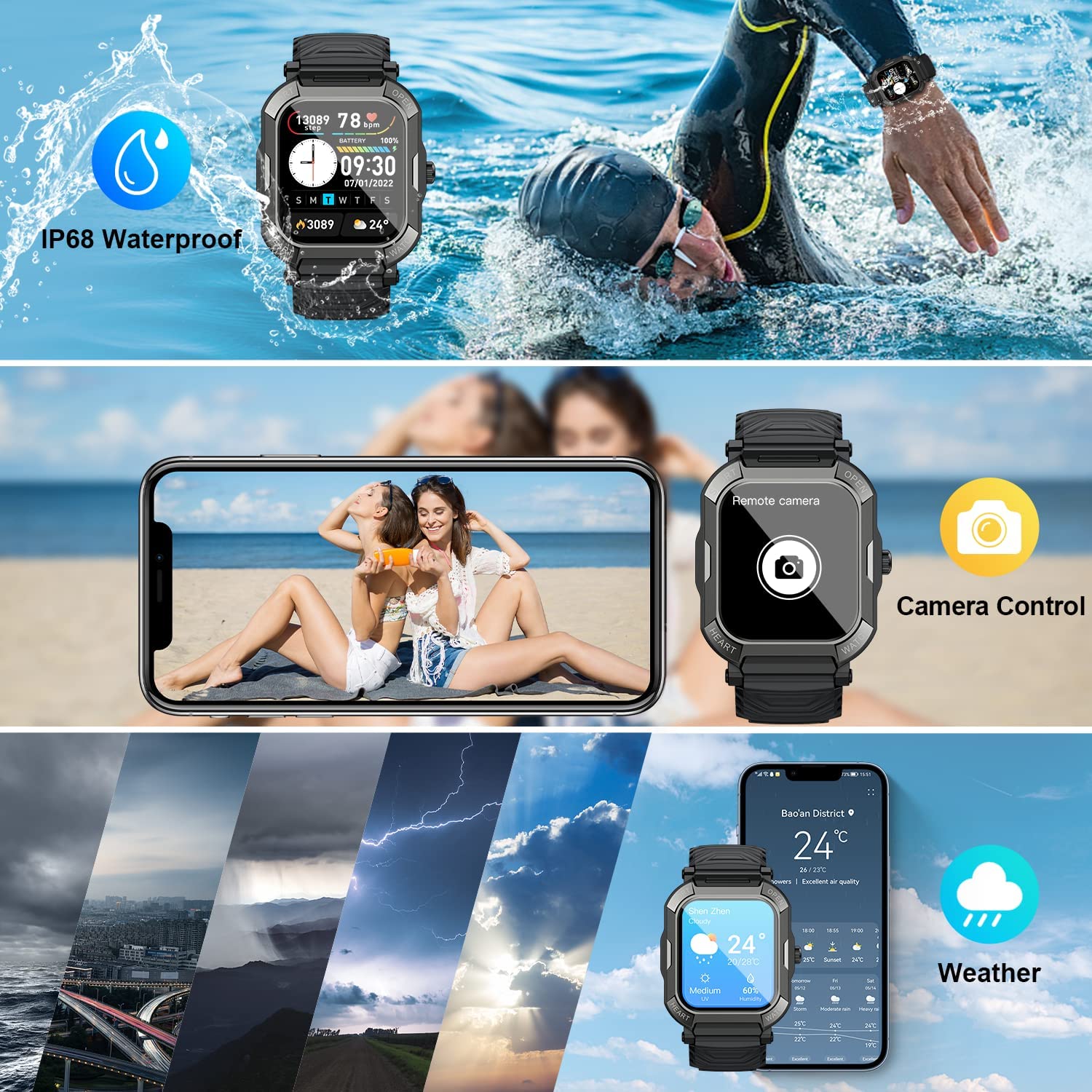 • Military smart watches for men - Special composite materials makes our running watch pass dozens of standard tests including temperature, low pressure altitude, dustproof, salt spray, fluid contamination, etc.Our military watches for men has passed drilling, crushing and hot steam scouring test which makes it suitable to be used in high temperature and high pressure environments. Rugged smart watch is going to be your ongoing reliable companion