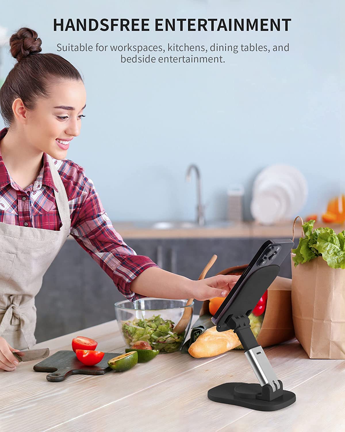 HANDS-FREE ENTERTAINMENT - Having this desktop phone holder to prop up your phone and adjust it to the ideal position, you can free your hands while watching videos, making phone calls, using Facetime, and viewing recipes. Plays a good role in your office, kitchen, nightstand, or dining table.