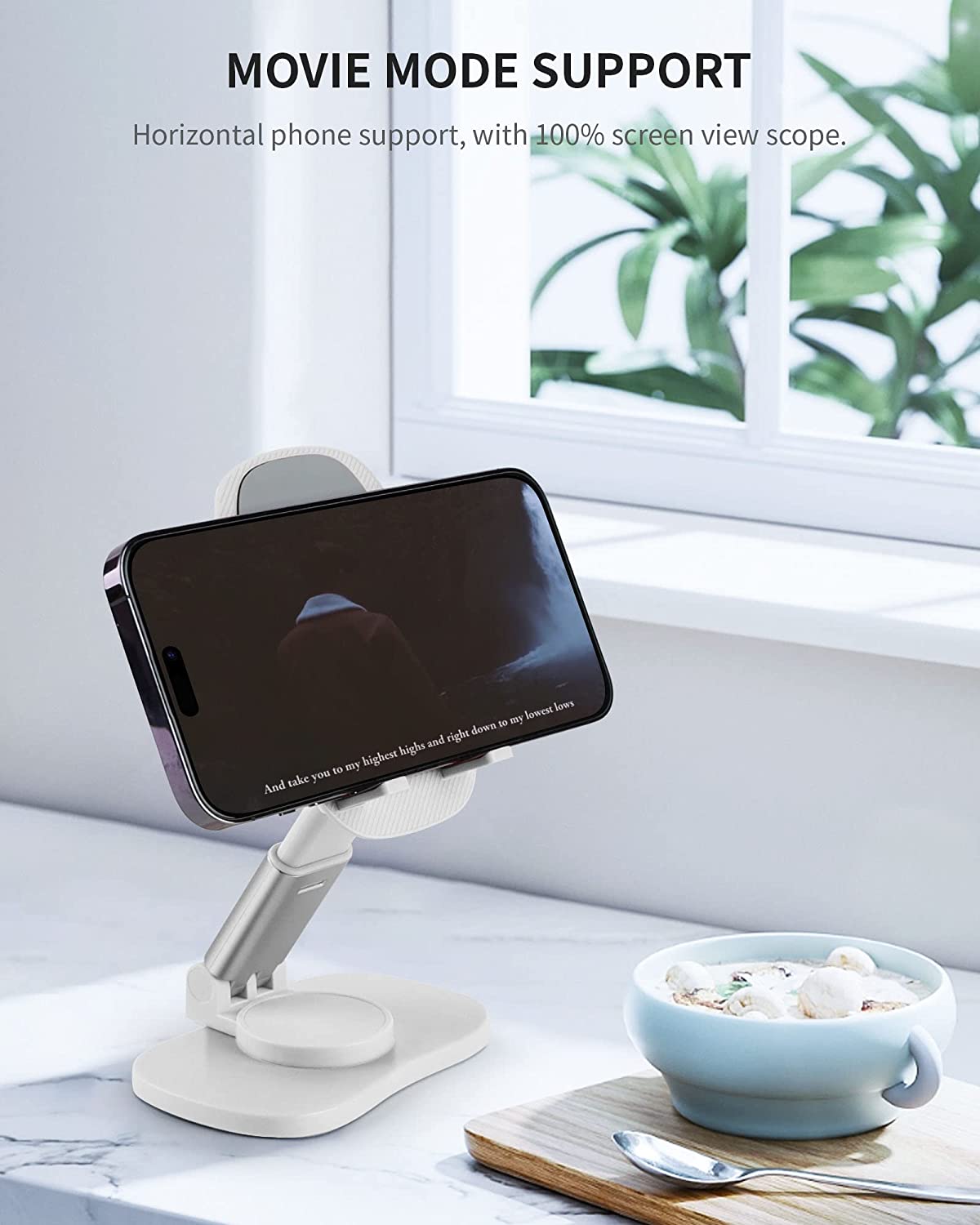 - HANDS-FREE ENTERTAINMENT - Having this desktop phone holder to prop up your phone and adjust it to the ideal position, you can free your hands while watching videos, making phone calls, using Facetime, and viewing recipes. Plays a good role in your office, kitchen, nightstand, or dining table.