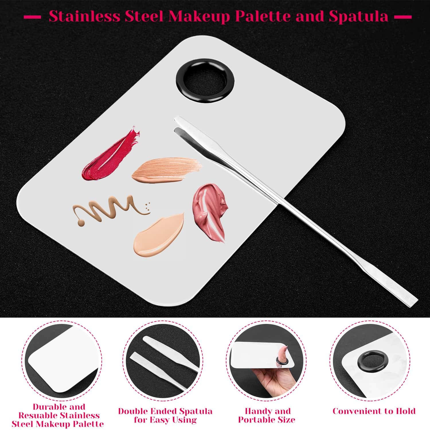• Premium Quality: The makeup mixing palette and spatula is made of high-quality stainless steel with mirror polish, rust proof and easily clean by water, durable and reusable. The makeup applicators accessories are constructed of hard plastic handle and soft fiber hair. This makeup tools supplies are convenient and easy to use.