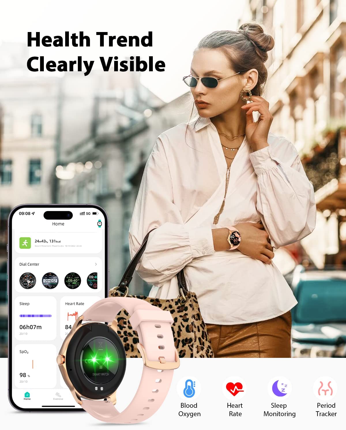 - 【Health Monitor & Women Health Care】Smart watch for android phones with advanced sensors provide insights to help you better understand your health and make a reasonable adjustment on your lifestyle. Keep an eye on your health metrics (24-hour heart rate, blood oxygen and sleep), as well as record female menstrual periods, personalize menstrual management and pregnancy preparation reminders for women.