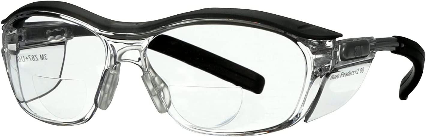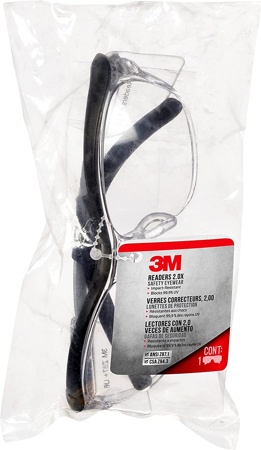 Protect your eyes and stay focused on the task at hand with the help of 3M Safety Eyewear. An excellent choice for you and all of your crew, these safety glasses help block small flying objects or particles, while providing essential protection from harmful UV rays. Classic dual lens design provides 99.9% UV protection with a built in bifocal power of +2.0. Black frame with clear lens. Adjustable temple lengths and lightweight construction. Meets ANSI Z87.1 and CSA Z94.3 standards.