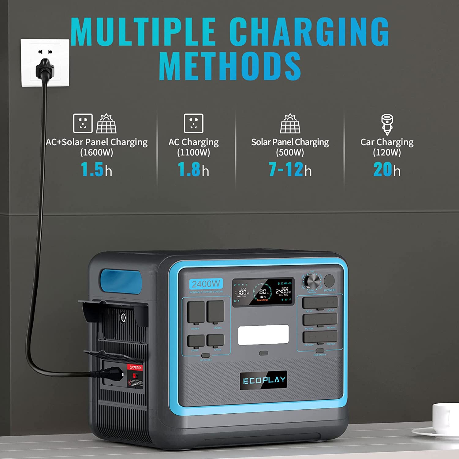 - 【FULL CHARGE IN 1.8 HOURS】Compare with other power station, Ecoplay 2400w power station adopts the most advanced bidirectional inverter technique with an AC input up to 1100W. it can be fully charged in 1.8 hours with AC adapter (included). It takes just 1.5 hours to fully charge with an AC outlet and Solar panel(500W) simultaneously. It takes 7 hours with solar panel(400W).17 hours with car charging.