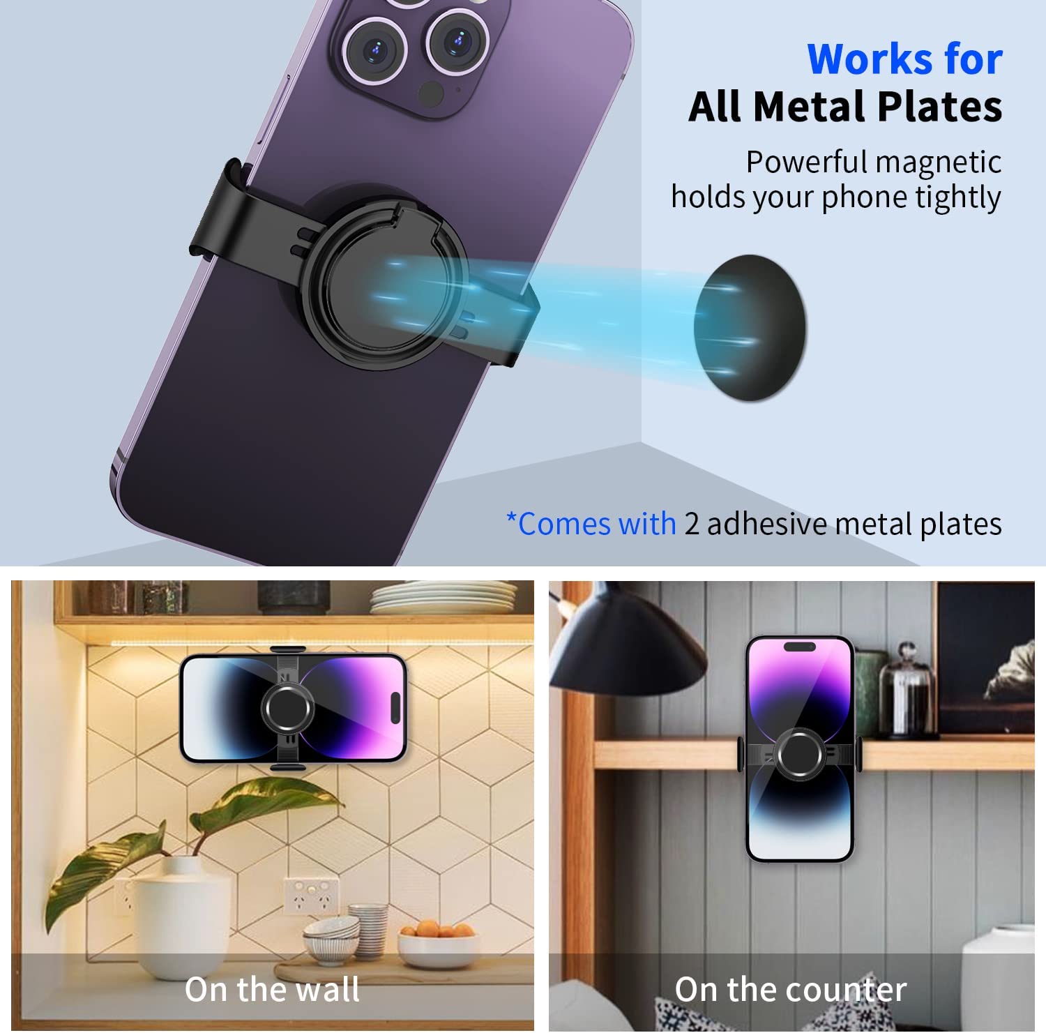 MOUNT PHONE ANYWHERE - Comes with 2 adhesive metal plates, which can be sticks to any flat surface like bathroom mirrors, Kitchen cabinet and walls. The strong magnetic phone clip use with metal panel hold the phone to mount your phone anywhere.