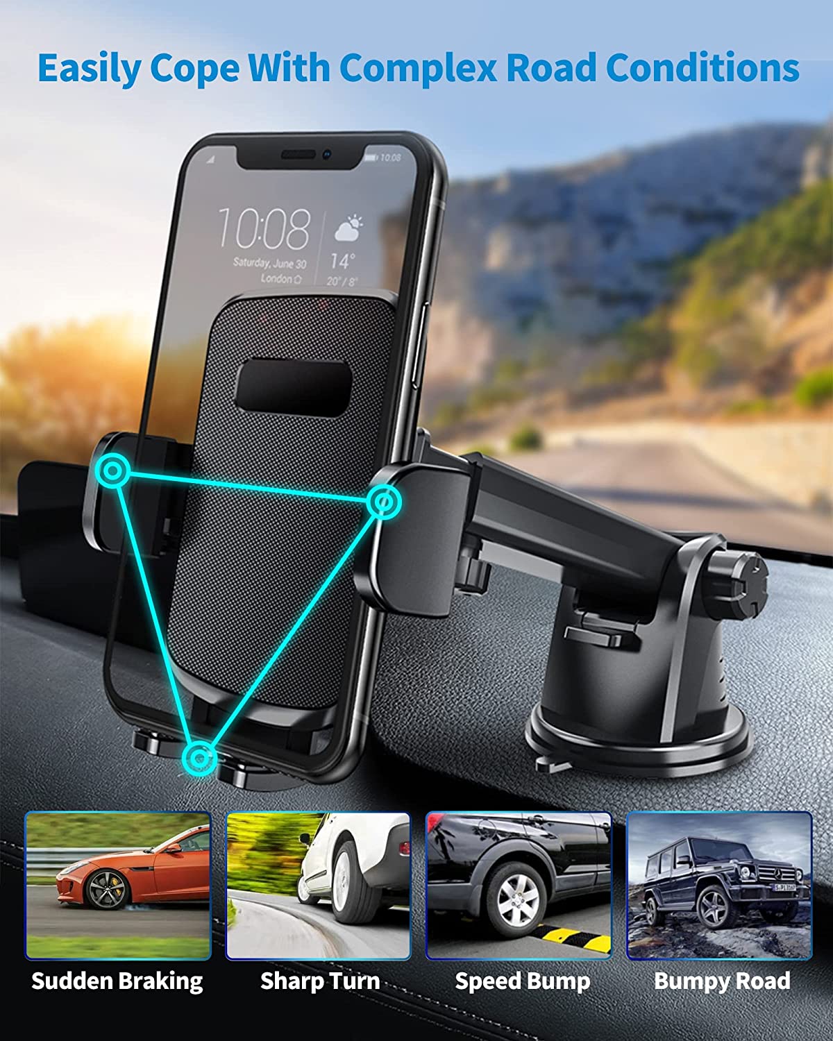 【Sturdy Upgrade】The suction cups are made of super viscous gel that can withstand temperatures from -4°F to 203°F, providing super suction to firmly fix the cell phone holder on the dashboard or windshield. If you want to move the position of the cell phone mount, you can wash the gel suction cup with warm water and let it dry and fix it where you want.