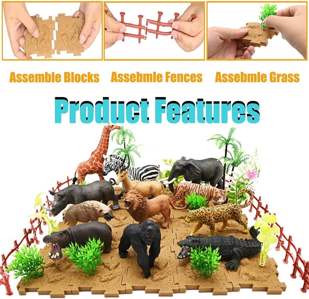 • PUZZLE BLOCKS: With 25pcs puzzle blocks for imitating the soil, 12pcs trees, grass and flowers, 15pcs fence. Your kids can build his/her own zoo world by herself/ himself. The Animals lovers will love this animals playset toys very much.