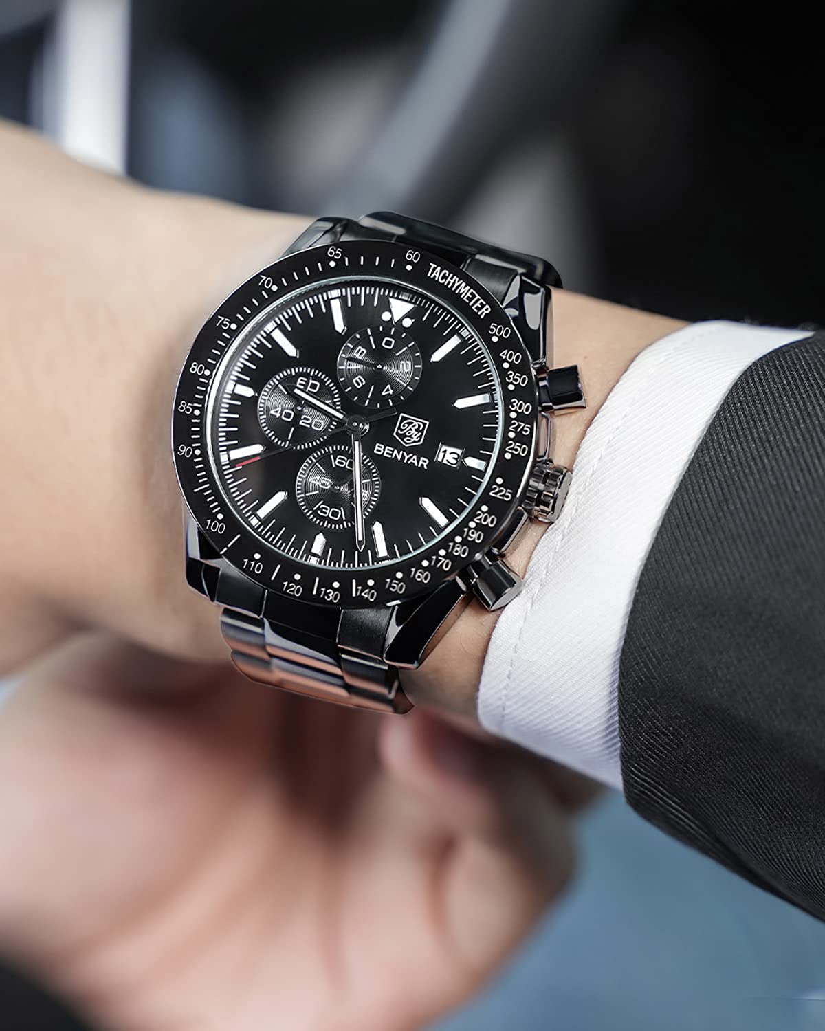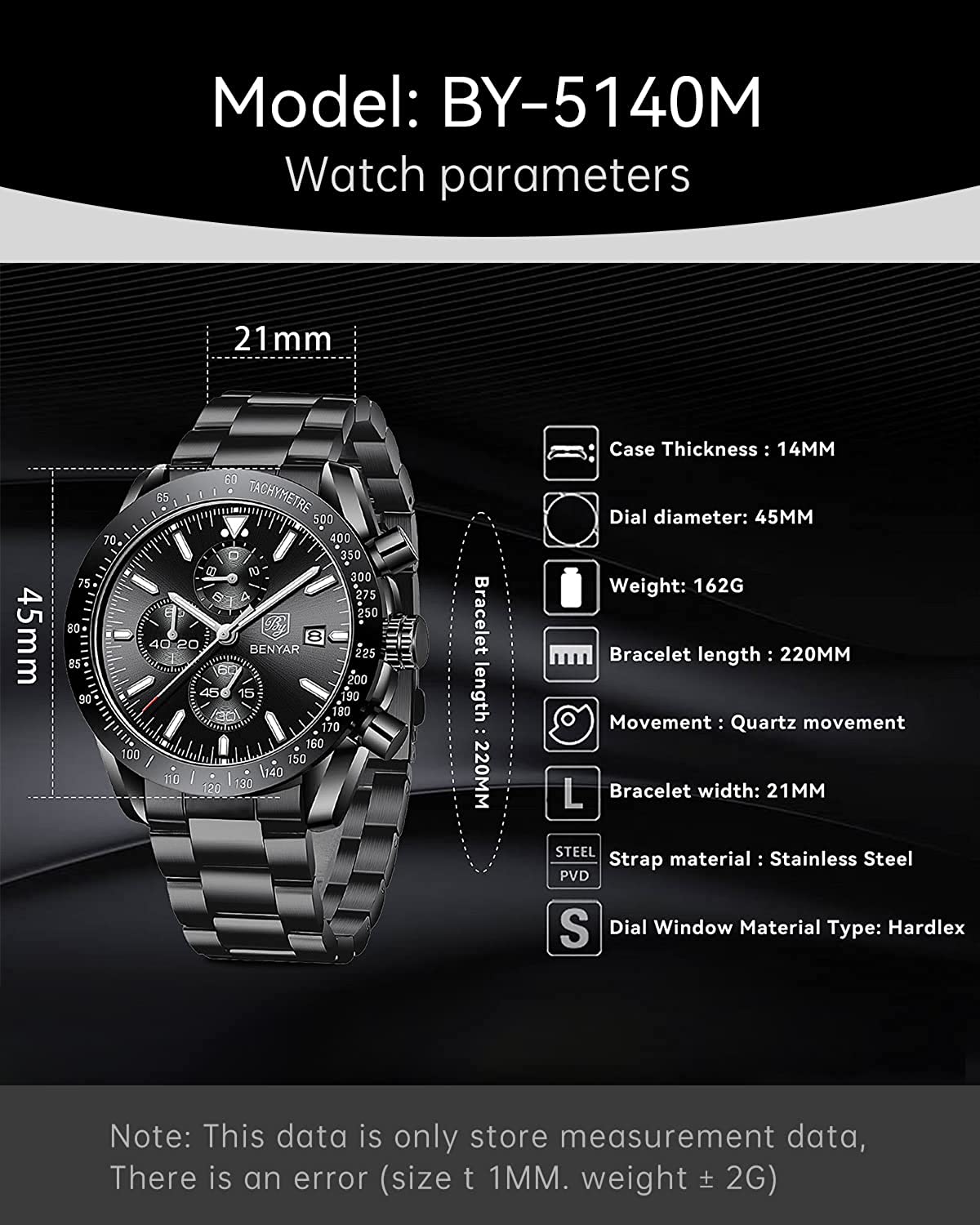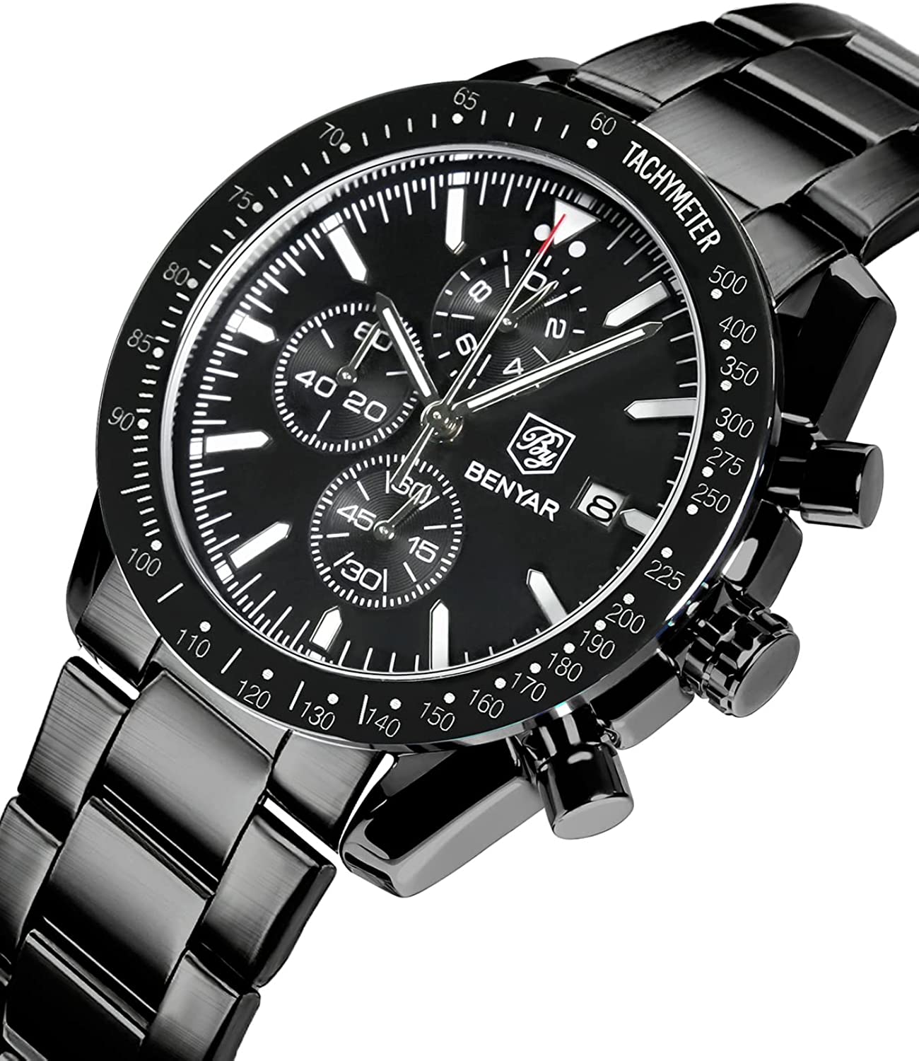 • ⌚ ELEGANT DESIGN: BY BENYAR offers a wide range of stylish luxury wrist watches specially crafted for men. The watch comes with 100% strong glass, black dial and tachymeter topring. The genuine stainless steel band with width 2.2cm and length 22cm give the watch a classy look. It is a multi-function chronograph with three sub-dial for second, minute and hour.