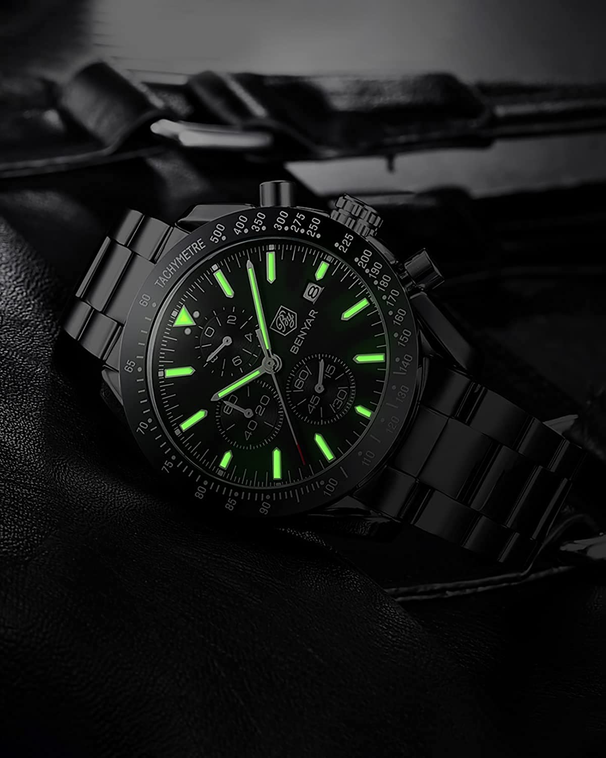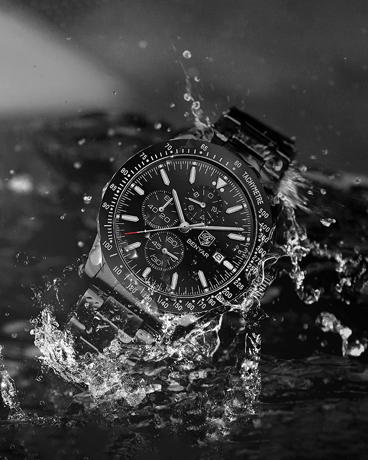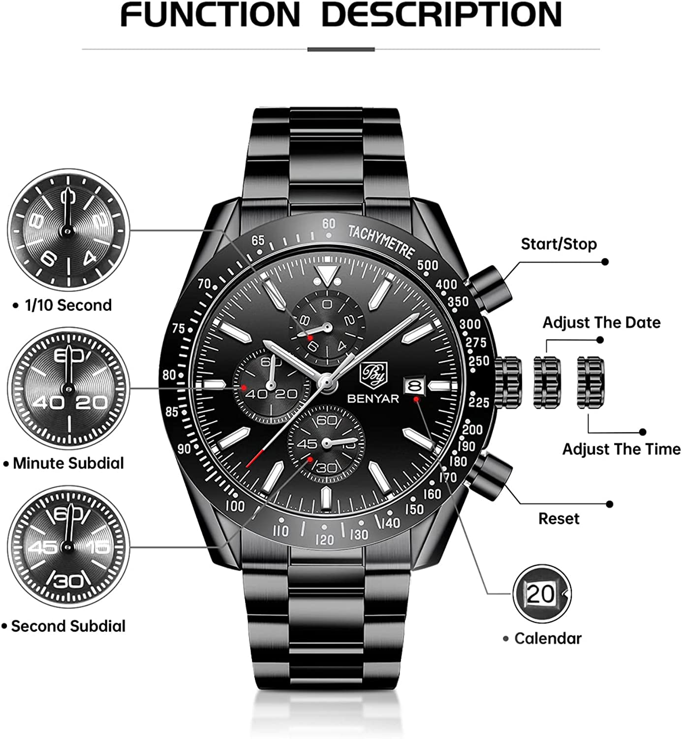 • ⌚ ELEGANT DESIGN: BY BENYAR offers a wide range of stylish luxury wrist watches specially crafted for men. The watch comes with 100% strong glass, black dial and tachymeter topring. The genuine stainless steel band with width 2.2cm and length 22cm give the watch a classy look. It is a multi-function chronograph with three sub-dial for second, minute and hour.