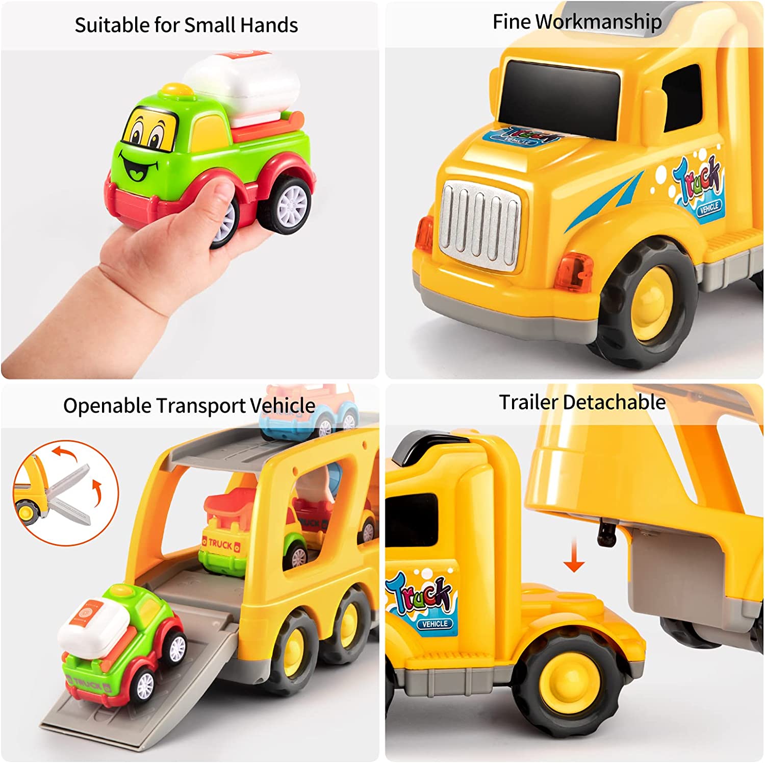 • Friction & Turnable & Removable: Just push and let it go,the hauler truck will carry four small engineering vehicles and set off! The head of the big carrier can also turn. After reaching, separate the cab and the traction compartment, and then open the tailgate to transport vehicles down. Pull the small vehicle back, the force of return allows them drive fast to start a construction job! Easy to play toys for baby.