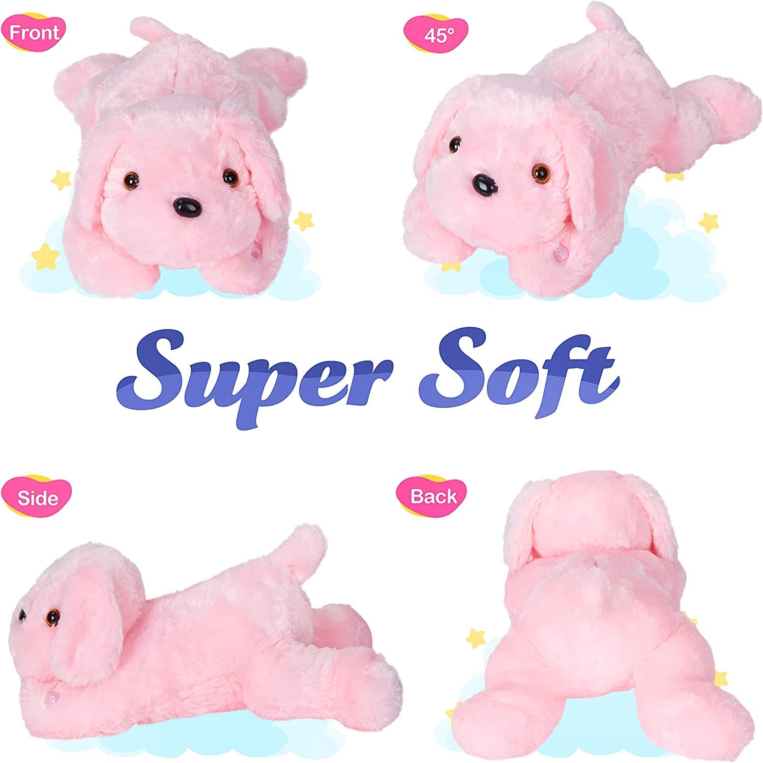 • ADORABLE IMAGE OF PUPPY---This pink LED dog stuffed animal features a quiet crouching dog. Quite a lot of people are living with dogs, however, to those who loves dog but are allergic to the fur or kids who are too little to hug a four-leg friend with paws and fangs, this glow soft plush toy dog may be a good alternative.