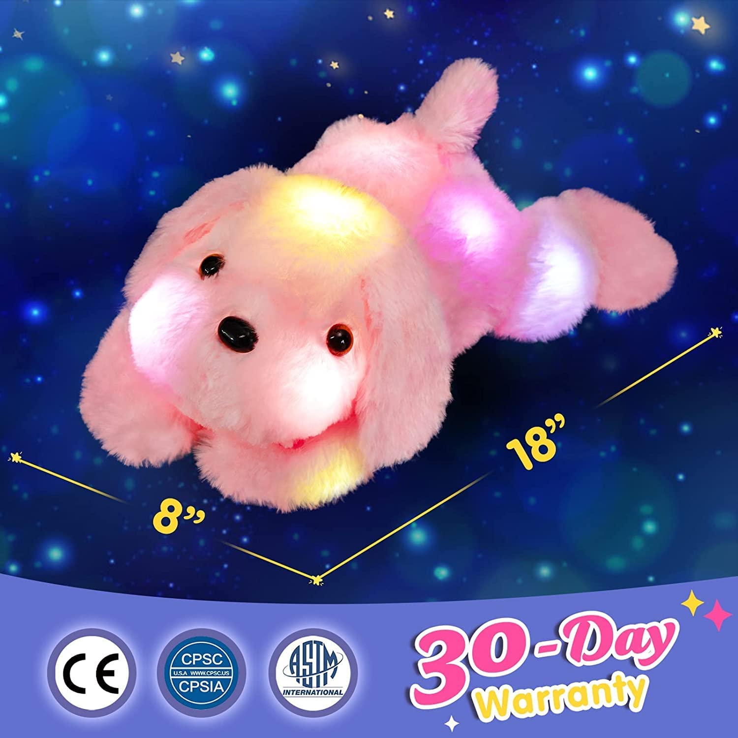 • CUDDLY SIZE AS STUFFED PILLOW---This light up dog is about 18 inch in length and 7 inch in height, appropriate size for both kids and adults to snug or cuddle when tired. It is a soft toy for children, decoration for families, and also nice gifts for friends, toddlers, teen, on Christmas, New Year, Birthday, anniversary and many other festivals.