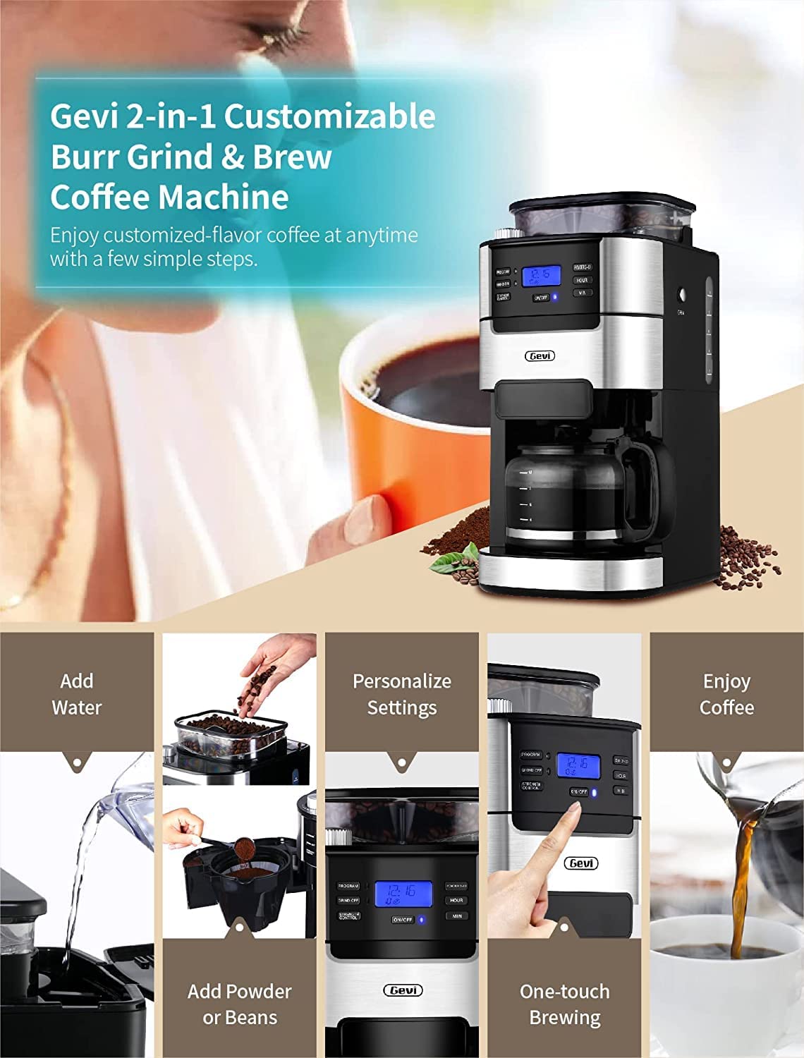 Included Components☕1 * Gevi Grind and Brew Automatic 10-Cup Drip Coffee Maker ☕1 * Glass Coffee Pot ☕1 * Scoop ☕1 * Permanent Filter ☕1 * Manual