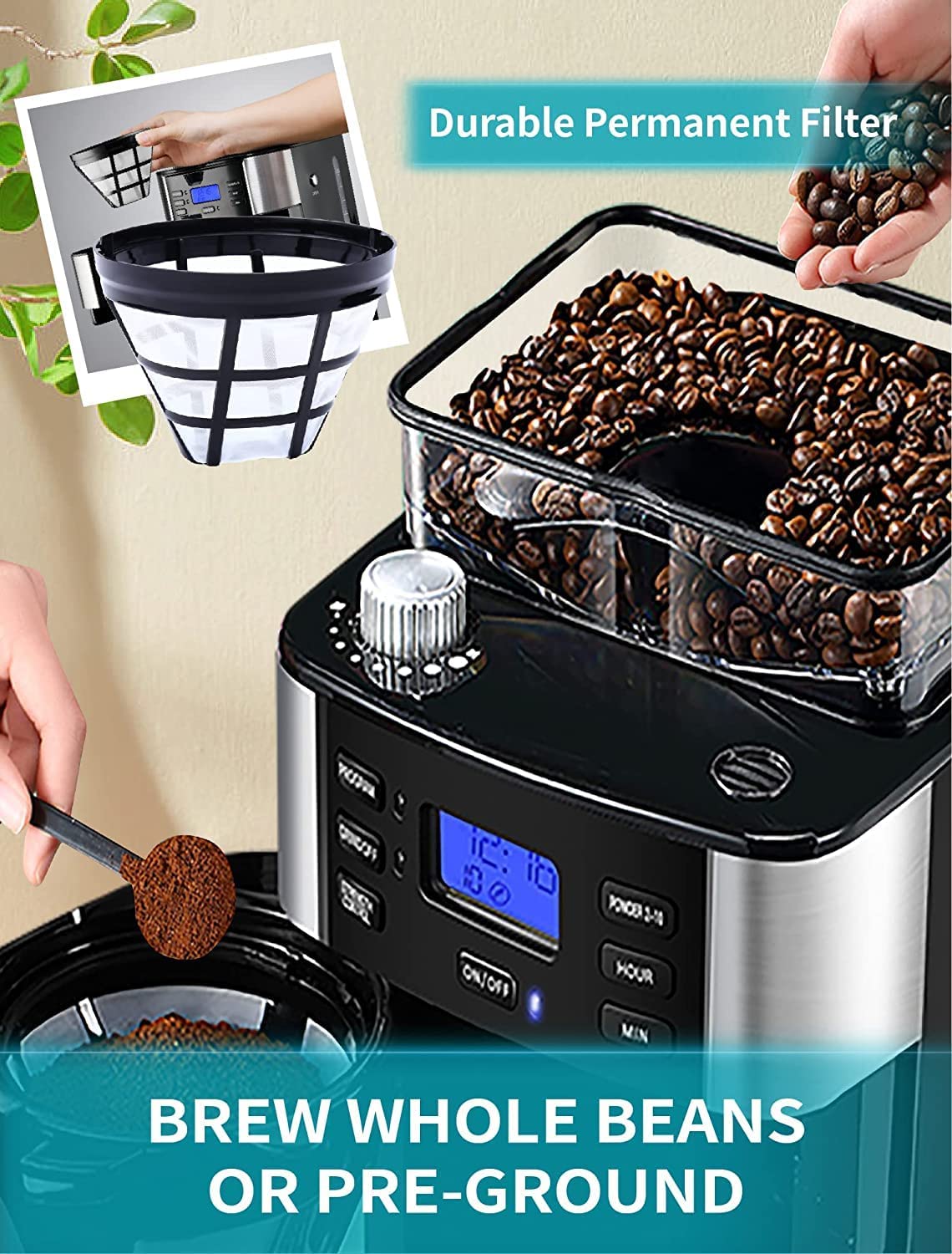 • ☕【1.5L LARGE CAPACITY】: The Grind Coffee Machine can brew up to 10 cups coffee. Set the number of coffee powder (2,4,6,8,10) through pressing "CUP 2-10" button base on your own needs. If not, the default number of cup is 10.【NOTE: when making coffee, the amount of coffee powder added should correspond to the amount of water, if the machine finishes without running out of corresponding amount of water, you can start it again.