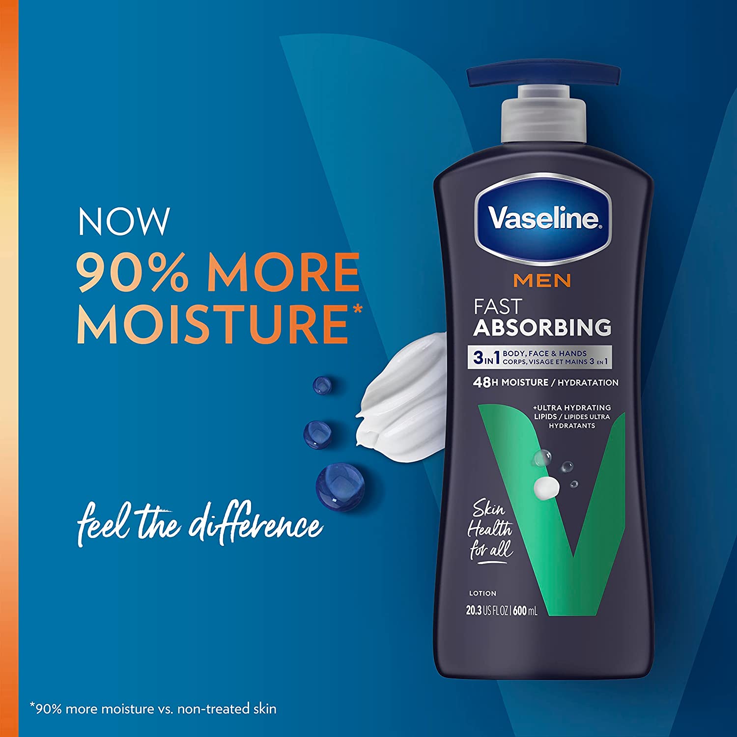 Vaseline Men’s Fast Absorbing Lotion is a 3-in-1 lotion suitable for face, body and hands. Our unique formula contains ultra-hydrating lipids and micro-droplets of Vaseline Jelly to help heal dry skin. This daily non-greasy lotion for men goes on easy, absorbs within 15 seconds, and leaves skin feeling fresh and moisturized. This body moisturizer is clinically tested to provide 90% more moisture (vs. untreated skin).