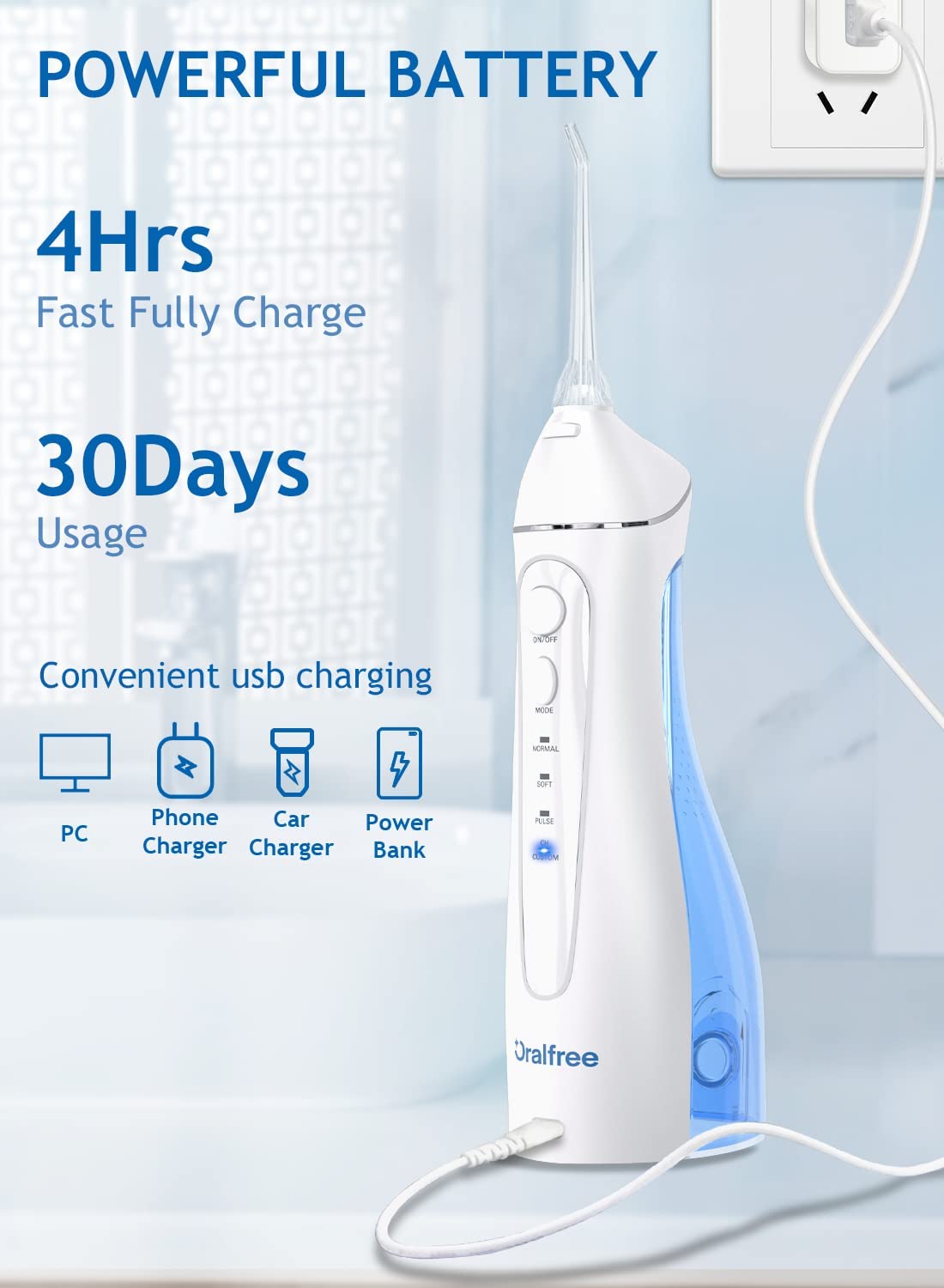 • 4 FLOSSING MODES POWER DENTAL FLOSSERS: Oralfree launch the newest portable water dental pick teeth cleaner items that was upgrade to 4 modes with Low-noise Design setting of water pressure to fulfilled your daily life use.Each mode provides you variety of using choice from standard mode, Please choose soft mode when you use dental flosser at the first time. Also helpful for bad breath, benefitful for bridge care