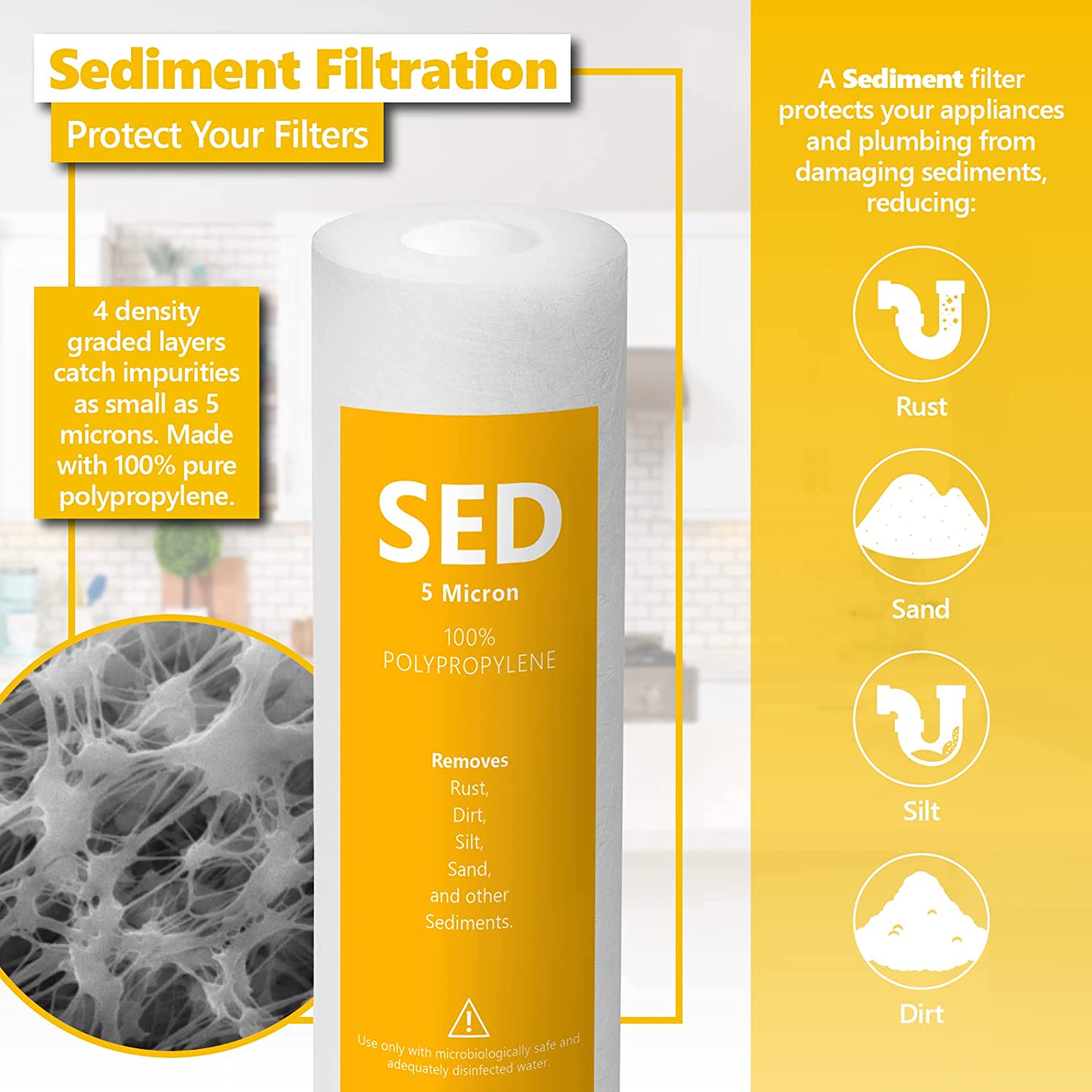 • Sediment Water Filter: Keep the most damaging sediments out of your drinking water and protect your other filters from coarse impurities including rust, sand, dirt and silt.