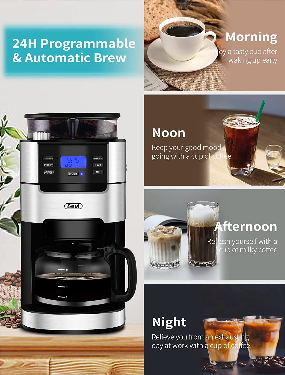 - ☕ 【AUTOMATIC START FUNCTION】: Entering the timer mode and setting the time you wanted to automatic start, the programmable timer will preset the machine start time and start brewing coffee at the specified time. There is a prompt bell after brewing. It helps to save time making coffee in the morning. After brewing, there is a warming plate design that the coffee can be warmed in the carafe lasts for 120 minutes.