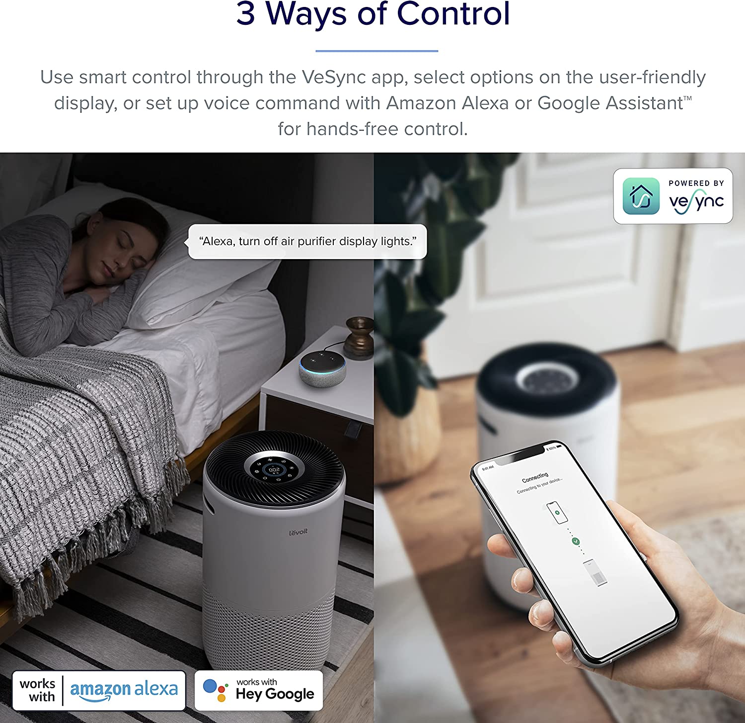 - Using compatible voice control services, control your air purifier with simple, spoken instructions. Works with Alexa and Googlevoice Assistant.
