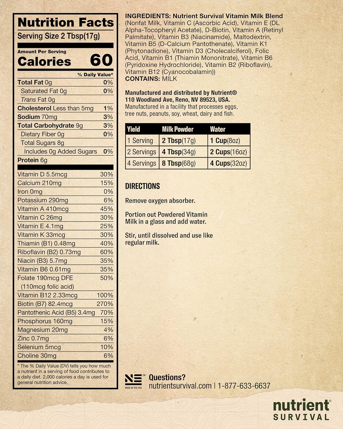 • Enjoy Nutrient Survival creamy, non-fat vitamin milk warm or cold. Just add water to the milk powder to get the instant milk ready to use. Nutrient dense powdered milk, a great go-to for both everyday and emergency situations