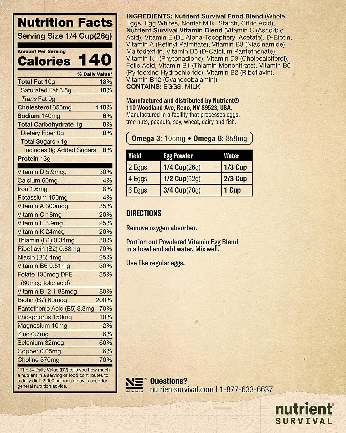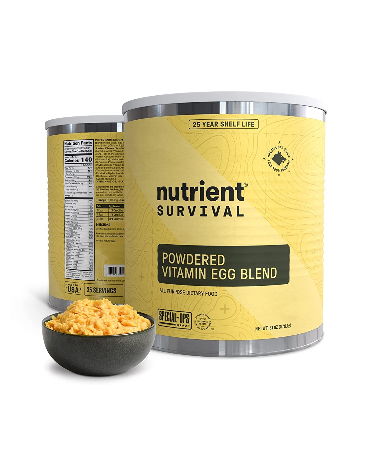 • FEED YOUR FREEDOM: Jump-start your day with Nutrient Survival Vitamin Egg Blend Powder. Just add water to get your powdered eggs ready to be used directly on the stove or in your favorite recipe. Nutrient dense, equivalent to 70 whole eggs per can