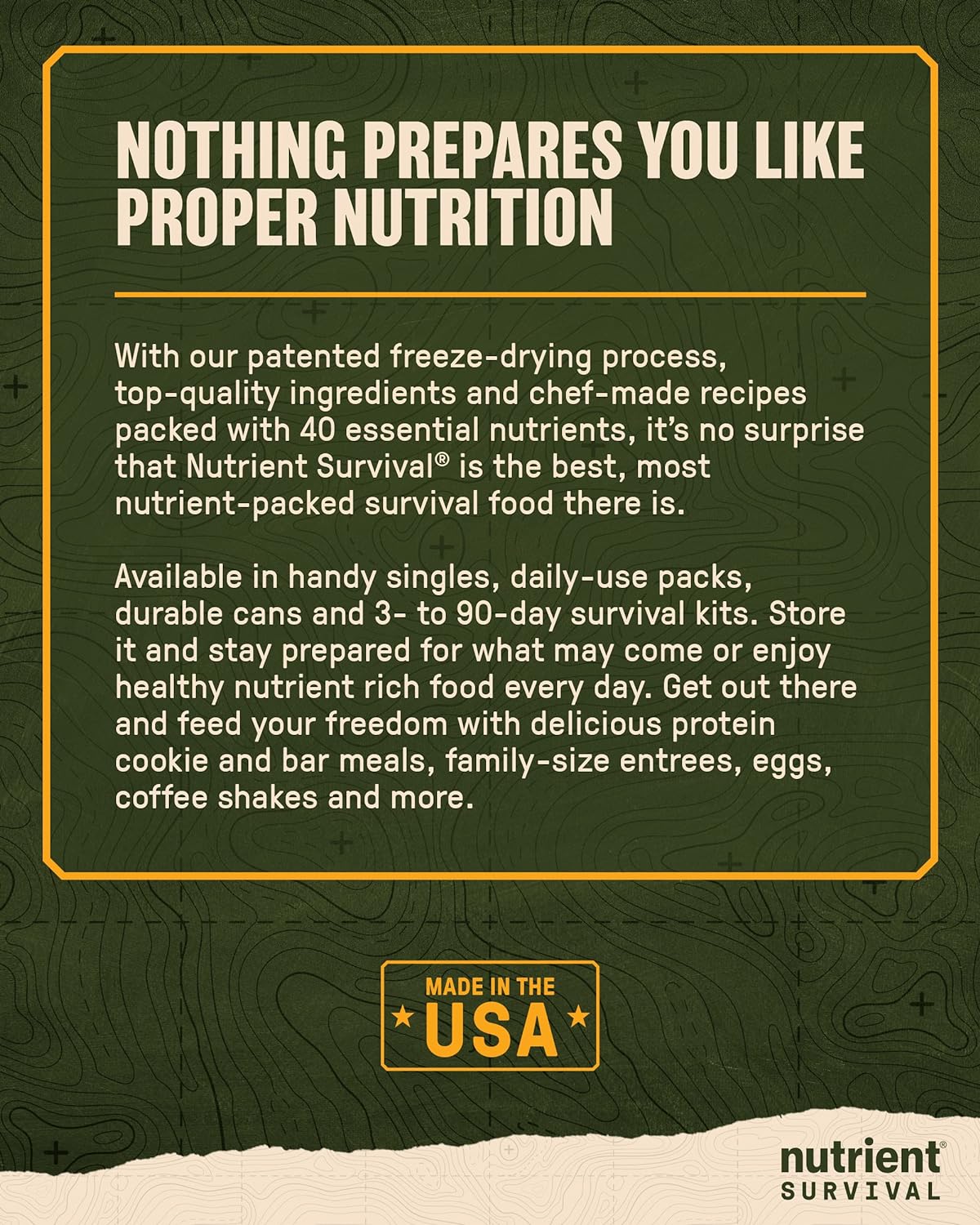• GO-TO NUTRITION WHEN NEEDED: Nutrient Survival foods are American born and made, ensuring the best, healthiest and supremely delicious nutrition. Perfect for times of stress, a quick snack, elevating performance, travel, prepper supplies or living off-the-grid