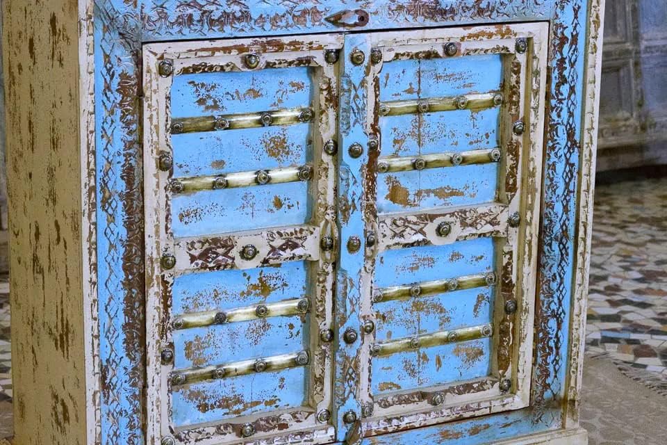 Antique Indian Brass Work Hand Carved Solid Wooden Cabinet Whitewash/Blue, Cabinet Storage Units Indian Solid Wood,Living Room Bedroom Furniture,Modern Cabinet